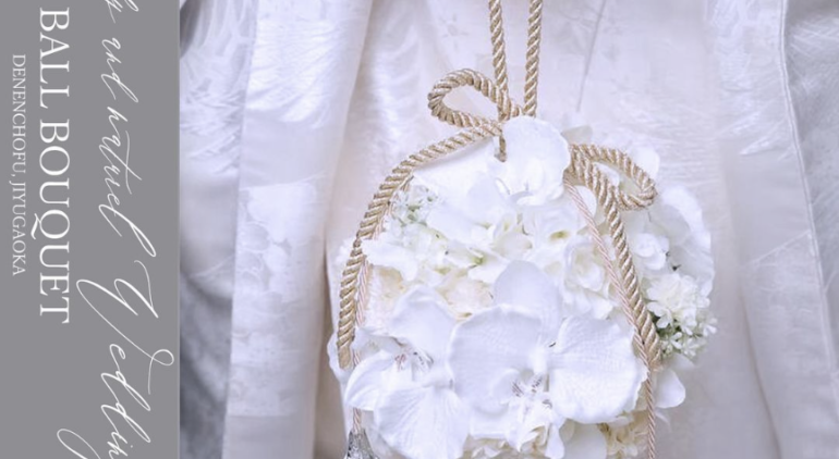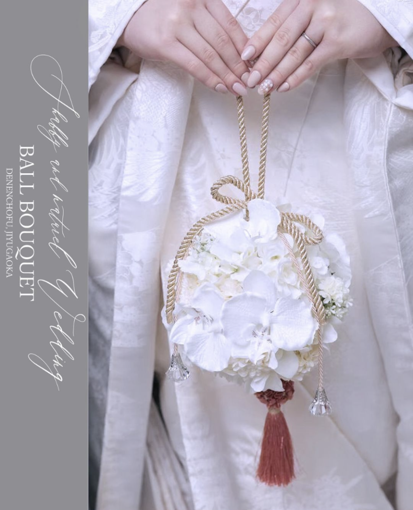 The smooth, rounded shape of the ball bouquet exudes a gentle, mellow grace, making it an ideal accessory for a bride in a Japanese kimono. Its soft, elegant form beautifully complements and enhances the bride’s overall appearance.